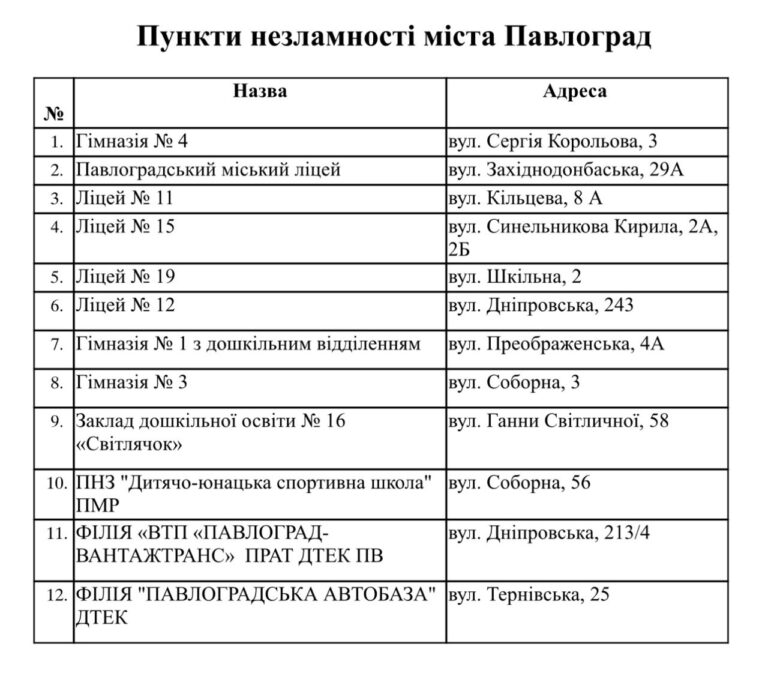 Згідно рішення міської комісії з питань техногенно-екологічної безпеки та надзвичайних ситуацій у Павлограді створено 12 «Пунктів незламності», основна мета яких — надати людям можливість зігрітися, зарядити гаджети тощо.