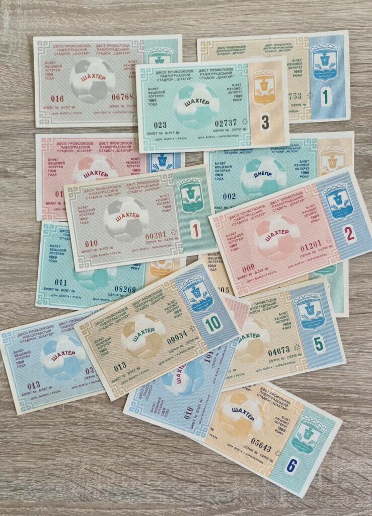 Колекція білетів речової лотереї 1989 року, організованої на стадіоні «Шахтар». Вони відображають атмосферу життя павлоградців у пізній радянський період та спортивну історію міста.