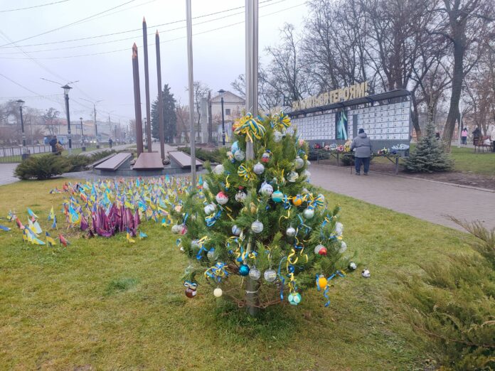 Замість звичних прикрас на ялинку повісили новорічні кульки з іменами загиблих, а також прикрасили дерево жовтоблакитними стрічками.