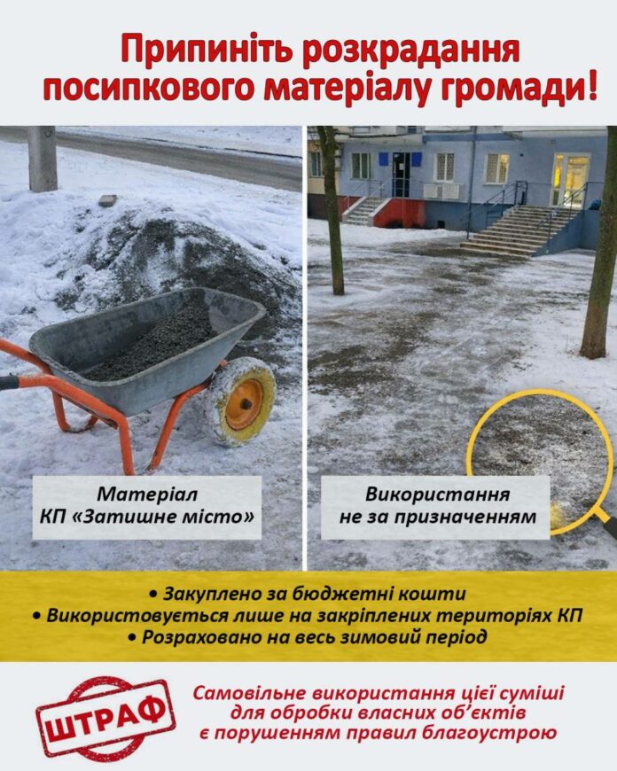 «Посипковий матеріал КП «Затишне місто» закуплений за кошти міського бюджету та призначений виключно для територій, закріплених за підприємством, на весь зимовий період», — зазначили на підприємстві.