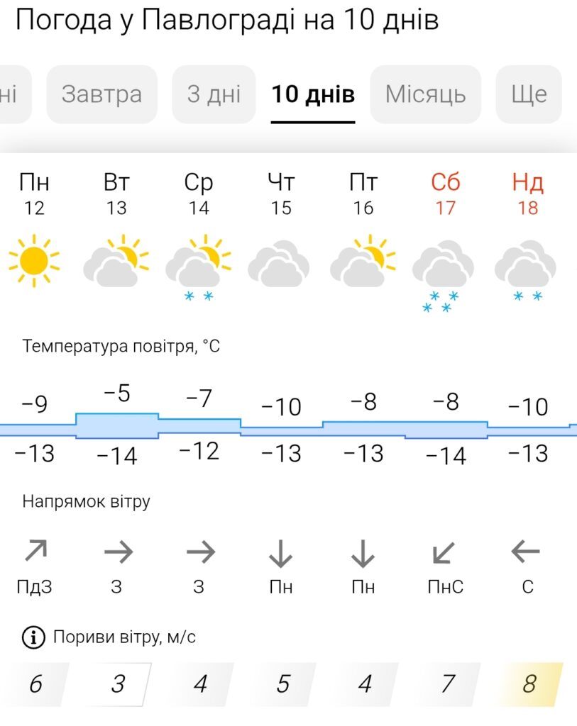 Згідно даних Meteofor, денна температура повітря коливатиметься від 7 до 10 градусів морозу, вночі очікується -12…-14 градусів.