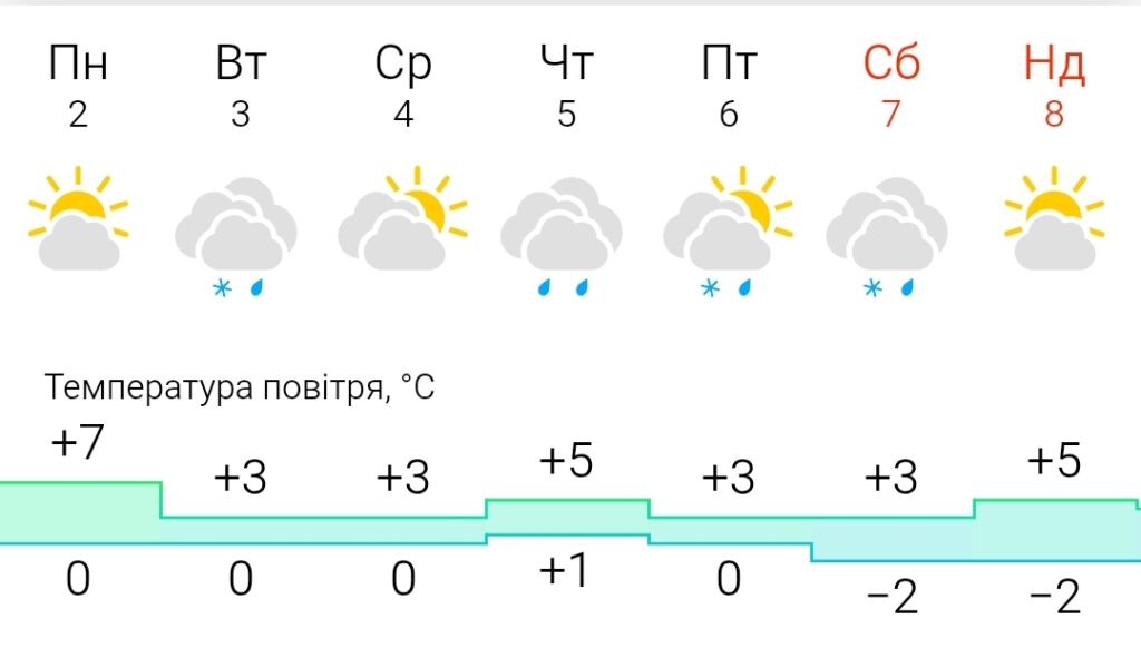 Температура повітря вночі коливатиметься від 0 до -2 градусів, вдень – від +3 до +5 градусів.