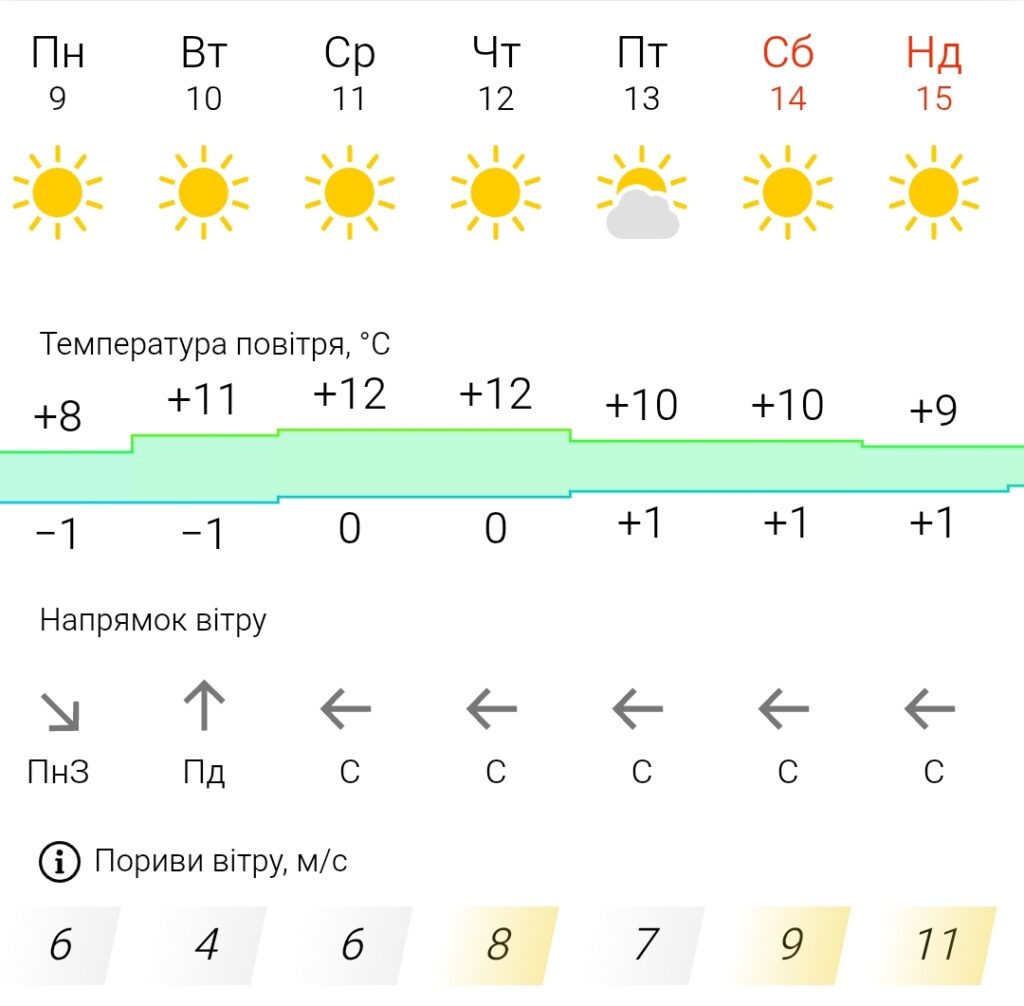 Денна температура повітря складатиме +10…12 градусів. Вночі прогнозують від -1 до +1 градуса.