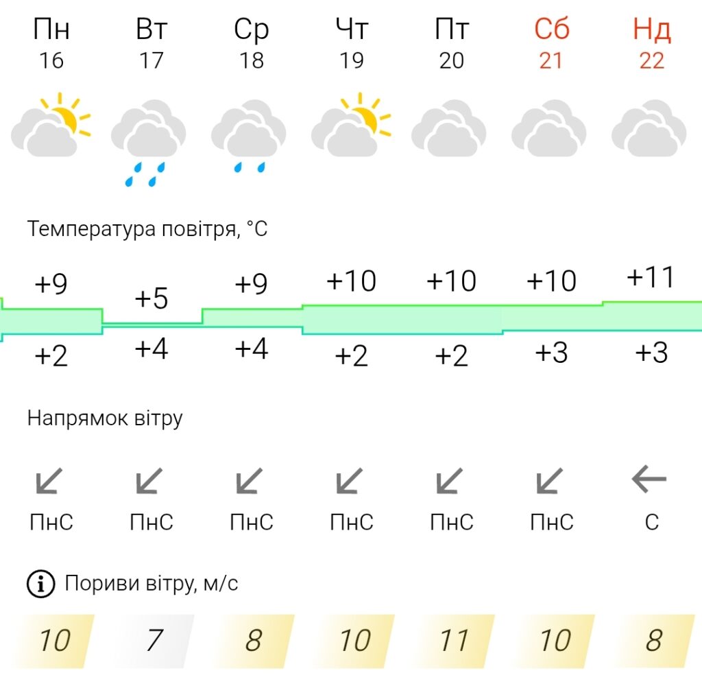 Згідно даних Meteofor, з 16 по 22 березня очікується хмарна погода. У вівторок та середу можливі дощі.