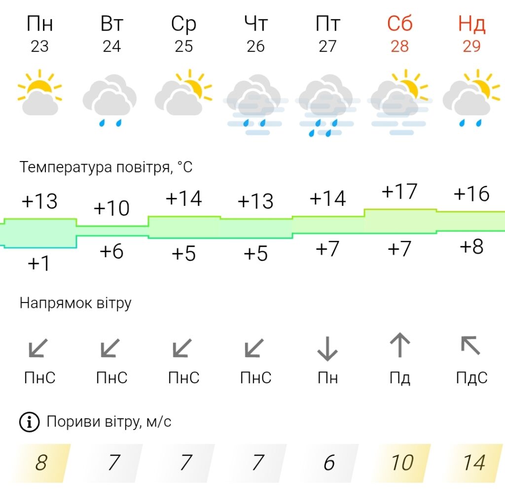 Швидкість вітру сягатиме 6-7 м/с, місцями пориви до 14 м/с.