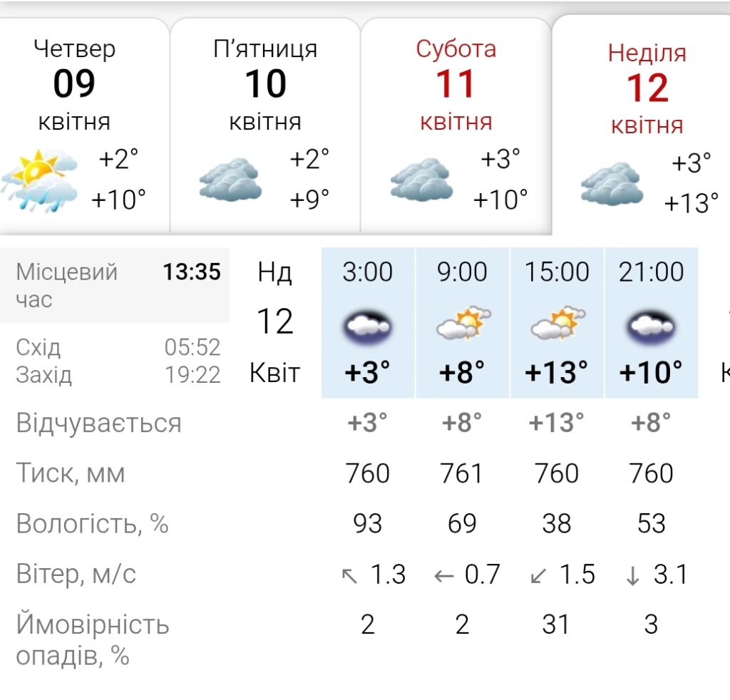 Температура повітря вранці складатиме +8 градусів, вдень буде 13 градусів тепла, ввечері стовпчики термометрів зафіксуються на позначці +10 градусів.