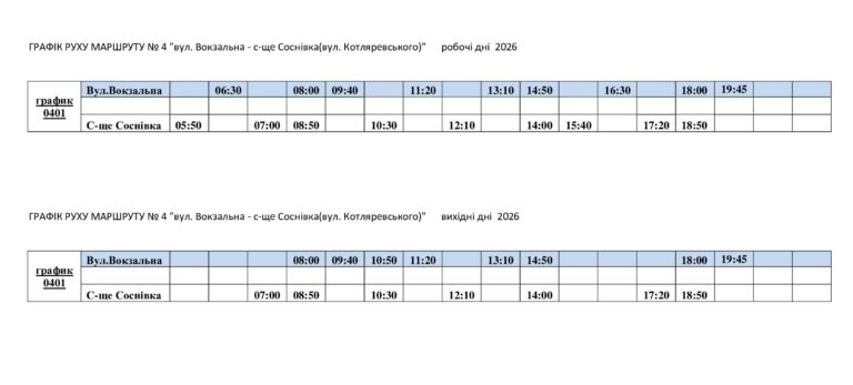 З 13 квітня у Павлограді діють нові графіки руху автобусу за маршрутом №4 сполученням вул. Вокзальна — сел. Соснівка.