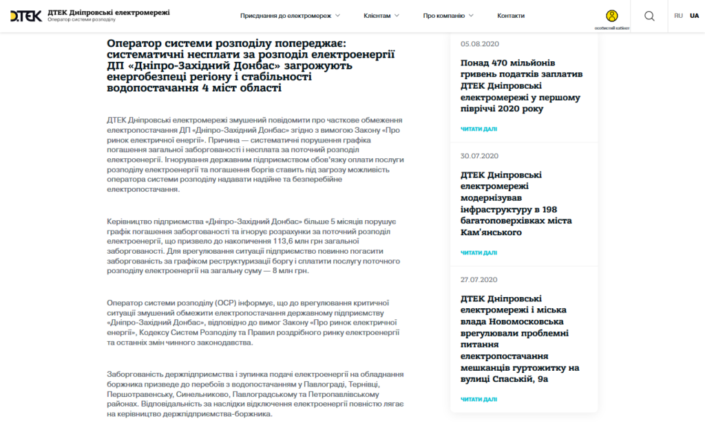 «Руководство предприятия «Днепр-Западный Донбасс» более 5 месяцев нарушает график погашения задолженности и игнорирует расчеты за текущее распределение электроэнергии, что привело к накоплению 113,6 млн грн общей задолженности. Для урегулирования ситуации предприятие должно погасить задолженность по графику реструктуризации долга и оплатить услугу текущего распределения электроэнергии на общую сумму – 8 млн грн”, – сообщили в ДТЭК Днепровские электросети.