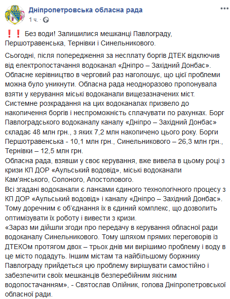 Днем 6 августа водовод «Днепр-Западный Донбасс» из-за долгов отключили от электроснабжения. Из-за этого прекратили водоснабжение на Синельниково, Павлоград, Терновку и Першотравенск, сообщают в пресс-службе облсовета.