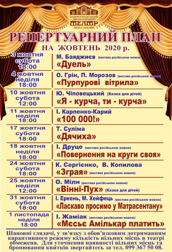 Павлоградський театр ім. Б. Захави: репертуар на жовтень
