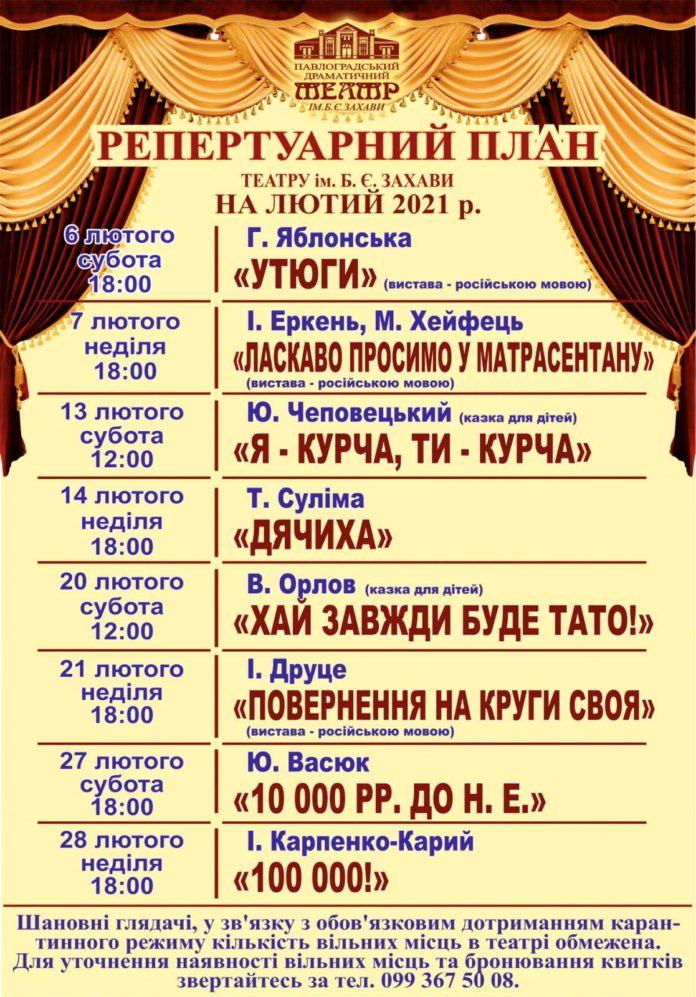 Павлоградський театр ім. Б. Захави: репертуар на лютий