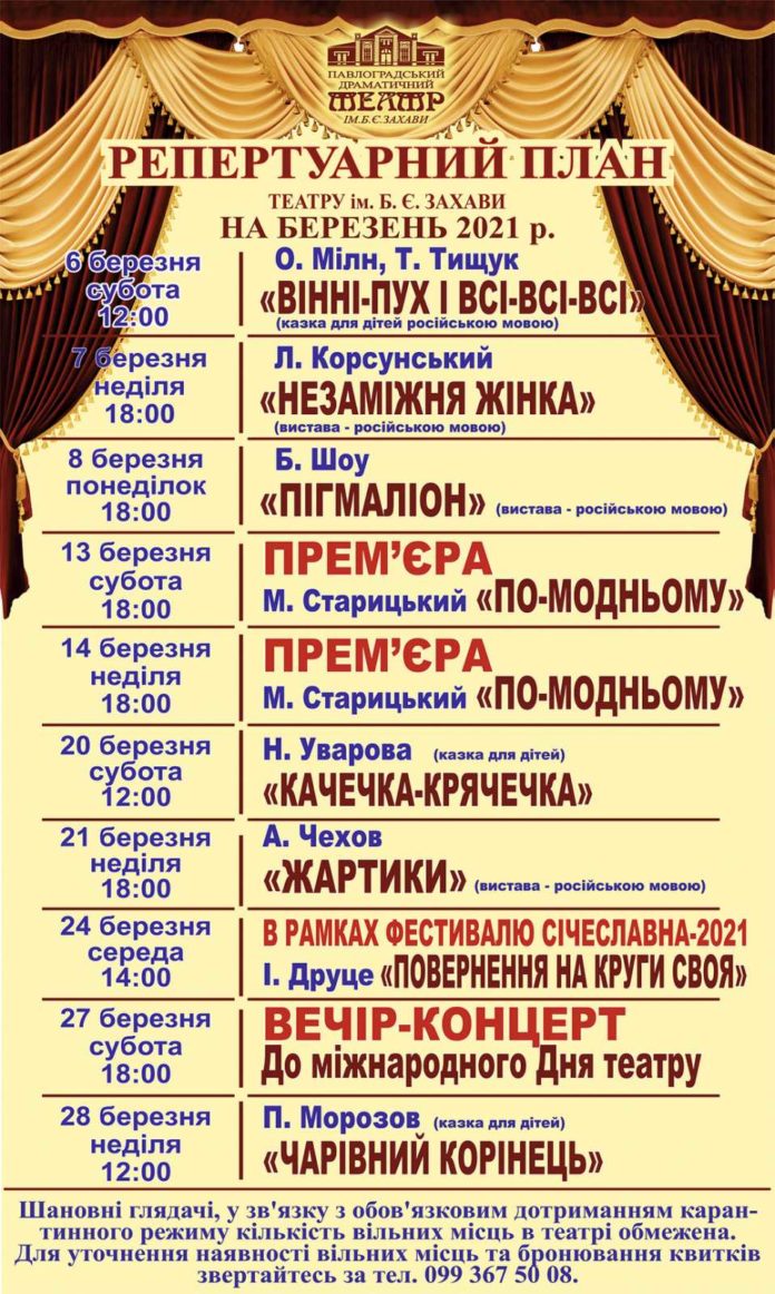 Павлоградський театр ім. Б. Захави: репертуар на березень
