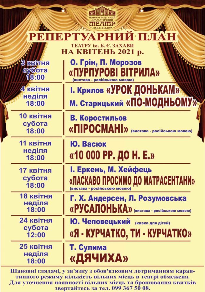 Павлоградський театр ім. Б. Захави: репертуар на квітень