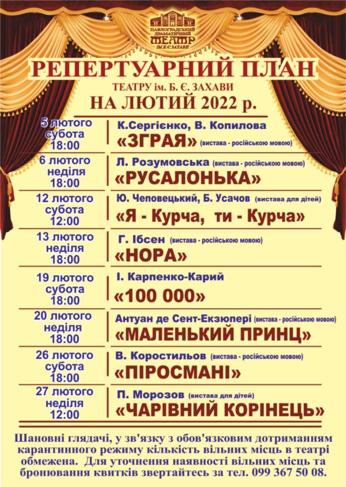 Павлоградський театр ім. Б. Захави: репертуар на лютий